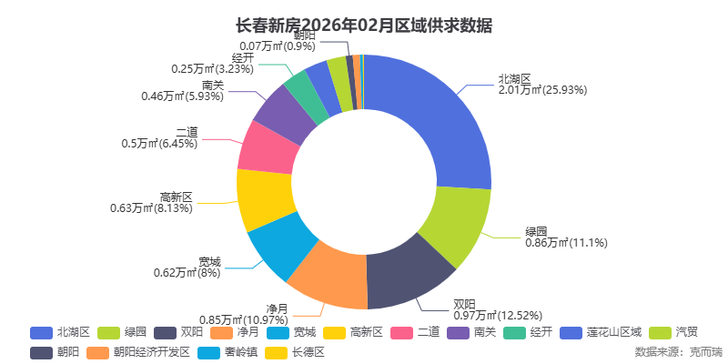 数据显示,2026年2月南关区新房成交面积仅0.46万㎡,占全市6%,排名第八。这反映出南关虽为核心城区,但供应稀缺、成交规模有限,竞争环境相对温和。
