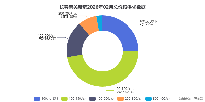 在南关区2026年2月成交数据中,总价100-150万元区间成交17套,占比47.2%;150-200万元成交6套,占比16.7%。紫逸观澜若按143㎡、单价1.1万元测算,总价约157万元,精准切入主力成交区间。