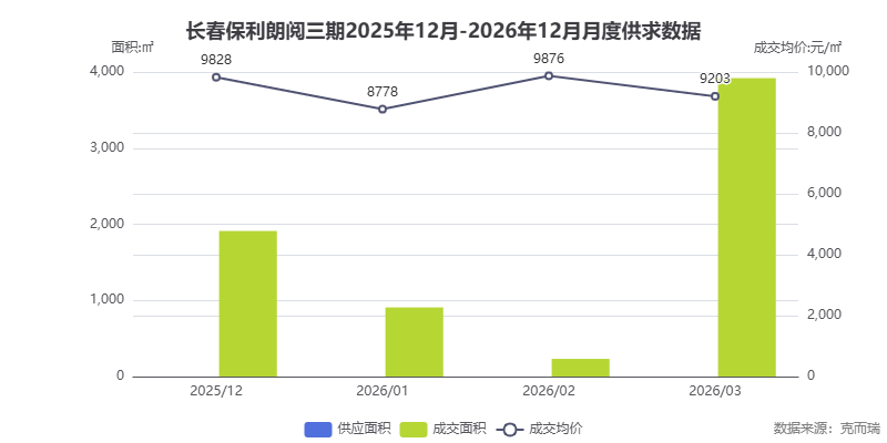 数据来源:克而瑞。2026 年 3 月成交面积显著回升至 3919㎡,成交均价稳定在 9200 元/㎡区间,反映市场认可度持续提升,尾盘阶段仍保持良好去化节奏。