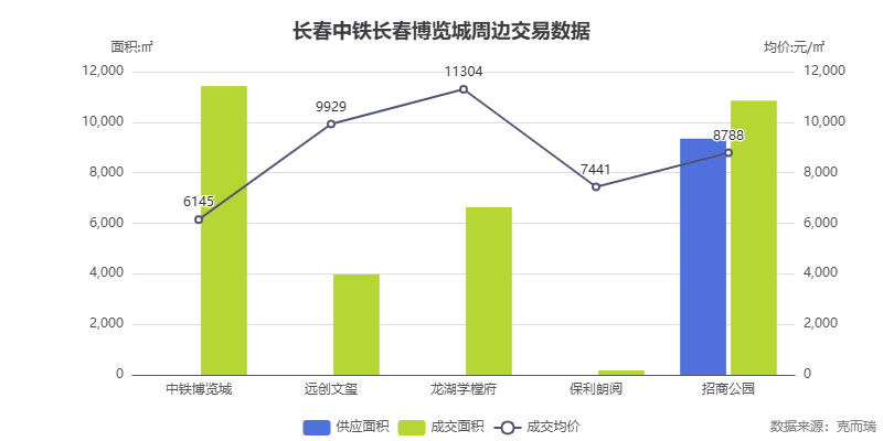 在周边 3 公里范围内,中铁长春博览城成交均价 6145 元/㎡,成交套数 110 套,领先于远创文玺(9929 元/㎡)、龙湖远创学樘府(11304 元/㎡)等竞品项目,价格竞争力显著。