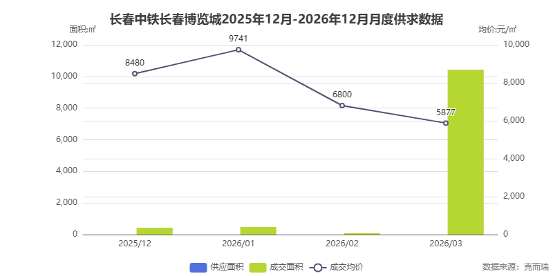 数据来源:克而瑞。2026 年 3 月成交面积环比增长超 120 倍,市场热度显著提升,成交均价稳定在 6000 元/㎡左右,性价比优势突出。