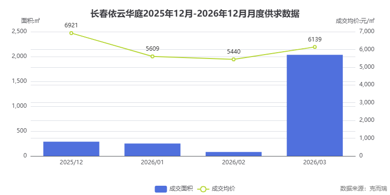 数据解读:以上图表展示了依云华庭近几个月的成交情况。数据显示,2026年3月项目迎来成交小高峰,成交面积达2035㎡,成交均价回升至6139元/㎡。这表明随着市场回暖,项目凭借高性价比吸引了大量刚需客户入市,量价表现均趋于稳定。数据来源于克而瑞。