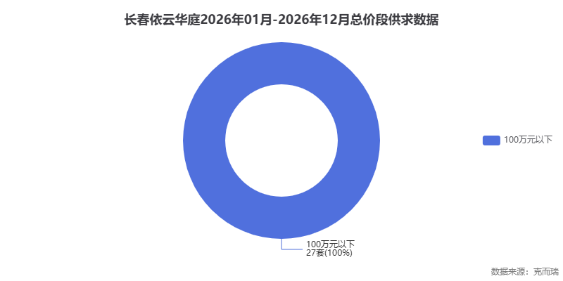 从总价段来看,依云华庭的成交主要集中在100万元以下区间。2026年1月至12月(预测/累计)数据显示,该总价段成交27套,套均价约为53万元。这一总价门槛对于长春市的刚需购房者而言极具吸引力,大大降低了上车难度。