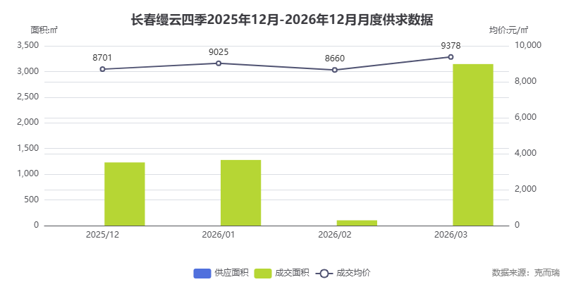 在2026年一季度长春楼市整体波动的大环境下,缦云四季展现出了极强的韧性。克而瑞数据显示,2026年3月,高新区新房成交均价为10423元/㎡,而缦云四季同期成交均价约为9378元/㎡(基于3月数据推算),相较于周边部分竞品,具有较高的性价比。尤其在2026年1月,项目以优异的销售成绩领跑高新区,验证了市场对其价值的认可。