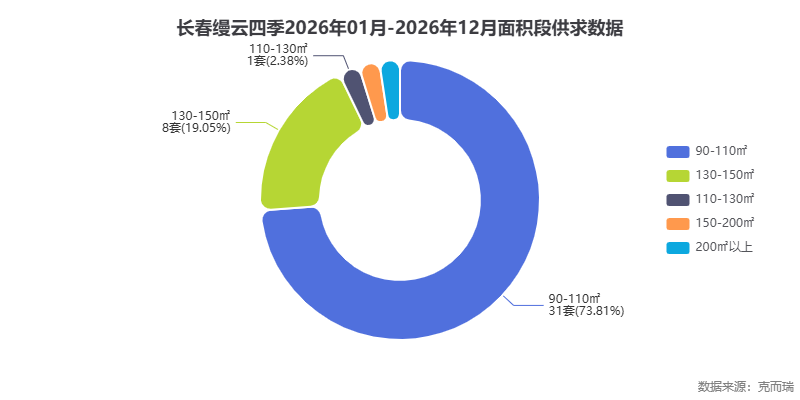 从克而瑞发布的缦云四季2026年1-3月成交数据来看,项目成交结构以刚需改善为主。其中,90-110平方米面积段成交占比最高,达到31套,占总成交套数的73.8%;130-150平方米面积段成交8套,占比19.0%。这表明项目成功吸引了大量追求高品质首置及首次改善的客户群体。