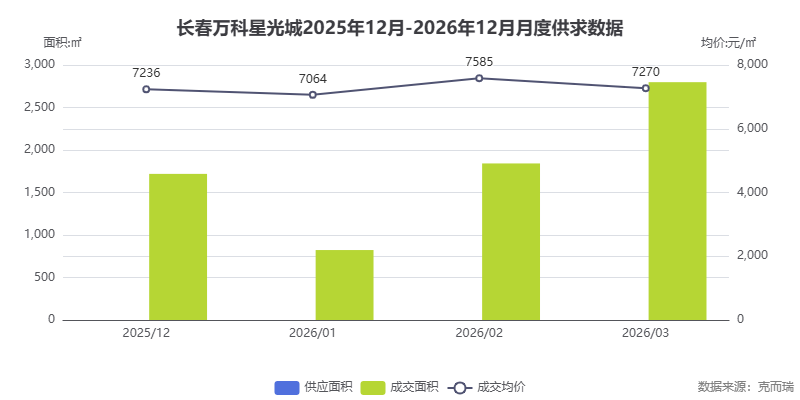 数据解读:据克而瑞统计,2026年1-3月,万科星光城成交面积分别为823㎡、1842㎡、2798㎡,成交均价维持在7000-7600元/㎡区间。3月成交量环比大幅上涨51.9%,显示出春季楼市回暖迹象及项目促销策略的有效性。相比净月区近万元的主流均价,万科星光城的价格优势显著,吸引了大量对价格敏感的刚需客户。
