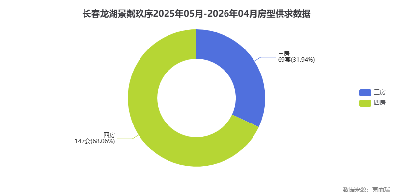 图表解读:根据克而瑞数据,在2025年5月至2026年4月期间,长春龙湖景粼玖序共成交216套。其中,四房户型成交147套,占比约68%,三房户型成交69套,占比约32%。这表明项目的主力客群为多代同堂或追求宽敞空间的改善型家庭,四房产品更受市场青睐。