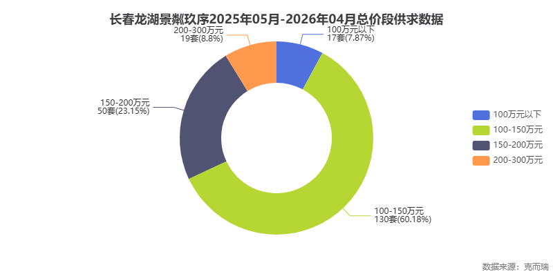 图表解读:克而瑞数据显示,项目成交总价主要集中在100-150万元区间,共成交130套,占比高达60%。150-200万元区间成交50套,占比23%。这说明项目的主流门槛适中,能够覆盖长春大部分中产改善家庭的预算范围,同时也提供了一定比例的高总价房源以满足终极改善需求。