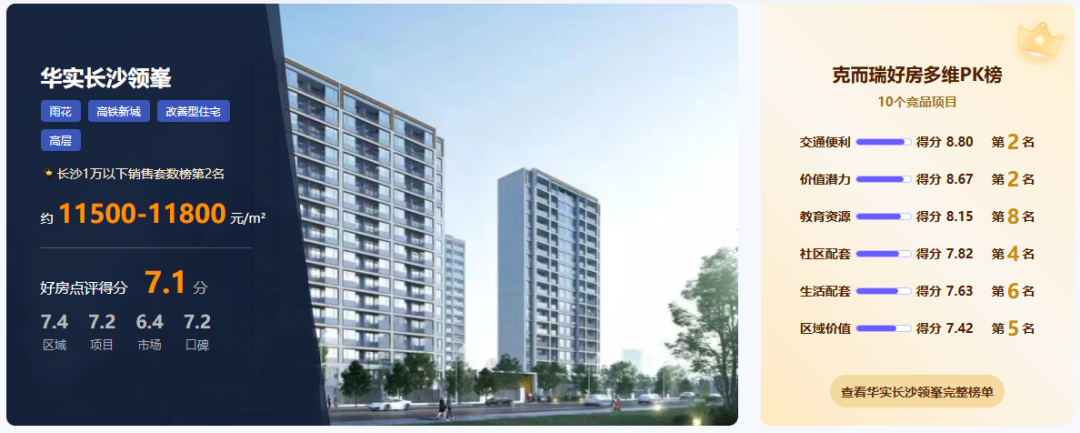 优势概述:根据克而瑞好房点评网测评,华实长沙领峯的优势集中于物业、交通与产品三大维度。项目以“高性价比改善盘”为核心标签,凭借万科物业服务、双轨交通潜力、成熟商业配套与高得房率,精准匹配预算有限但注重居住便利性与空间效率的刚需改善家庭需求。