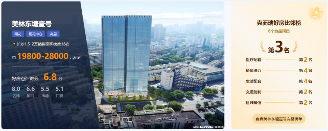 优势概述:根据克而瑞好房点评网测评,美林东塘壹号的优势集中于区位、精装与产品三大维度。项目以“主城豪宅”为核心标签,凭借雨花中心核心地段、超100%得房率、德系精装科技与成熟医疗商业配套,精准匹配注重生活便利性与空间效率的改善家庭需求。