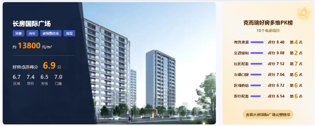优势概述:根据克而瑞好房点评网测评,长房国际广场的优势集中于产品、品牌与区位三大维度。项目以“高得房率改善盘”为核心标签,凭借主力大平层的高空间效率、长房集团国企品牌背书及芙蓉区核心区位,精准匹配注重空间实用性与交付确定性的改善家庭需求。