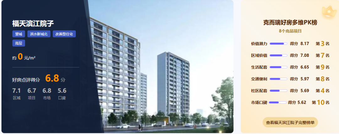 优势概述:根据克而瑞好房点评网测评,福天滨江院子的优势集中于产品、生态与区位三大维度。项目以“生态改善盘”为核心标签,凭借“户户花园大平跃”创新产品、102%-115%超高得房率及张家湖湿地公园稀缺生态资源,精准匹配注重空间实用性与生态居住的刚改家庭需求。