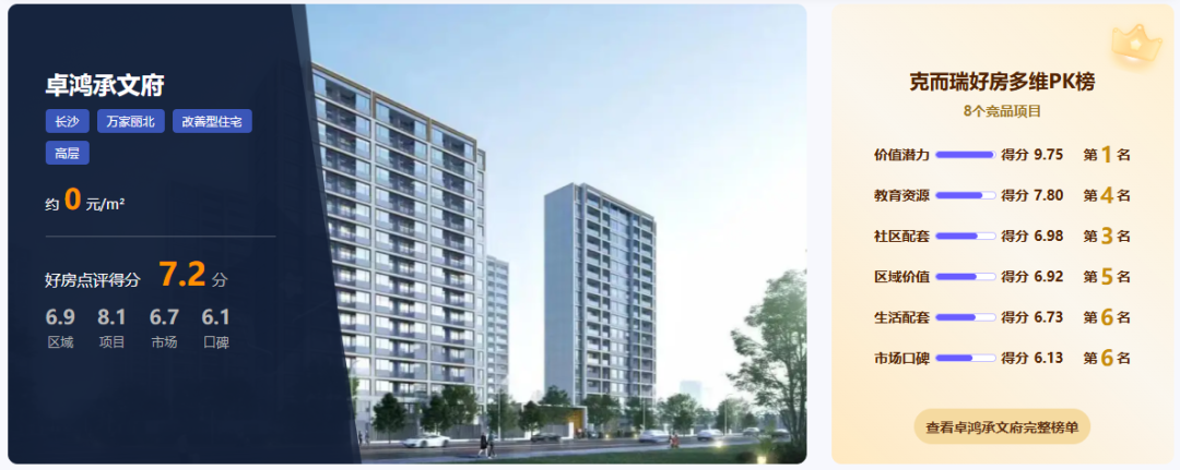优势概述:根据克而瑞好房点评网测评,卓鸿承文府的優勢集中于产品、教育与区域潜力三大维度。项目以“高得房率改善盘”为核心标签,凭借超100%得房率、1.8低密纯板洋房及师大附中名校学区,精准匹配注重空间效率与子女教育的家庭需求,成为万家丽北板块的实用型改善标杆。