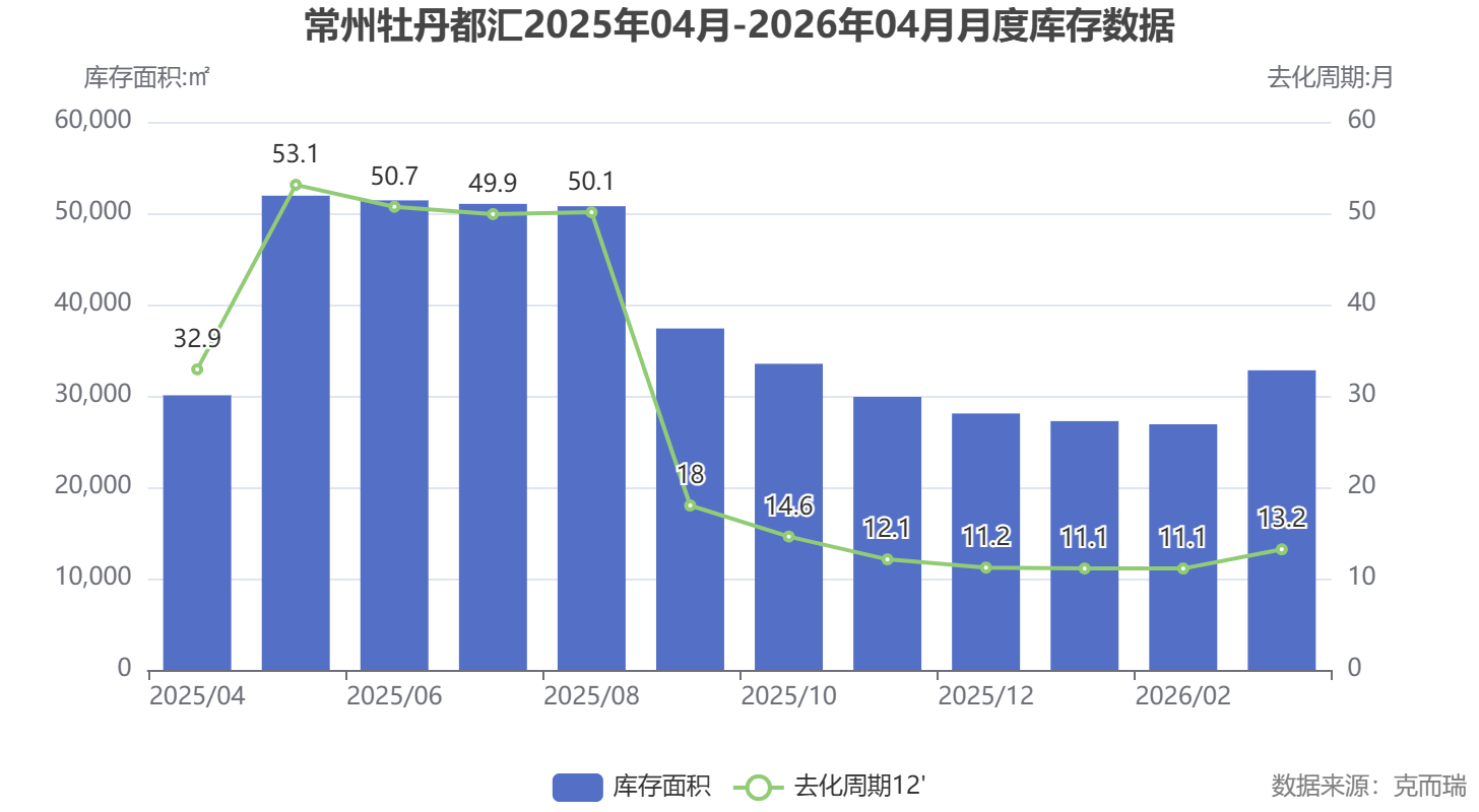 从库存数据来看,截至2026年3月,牡丹都汇的库存面积为32,796.16㎡,库存套数287套,去化周期(按近12个月平均速度计算)约为13.2个月。