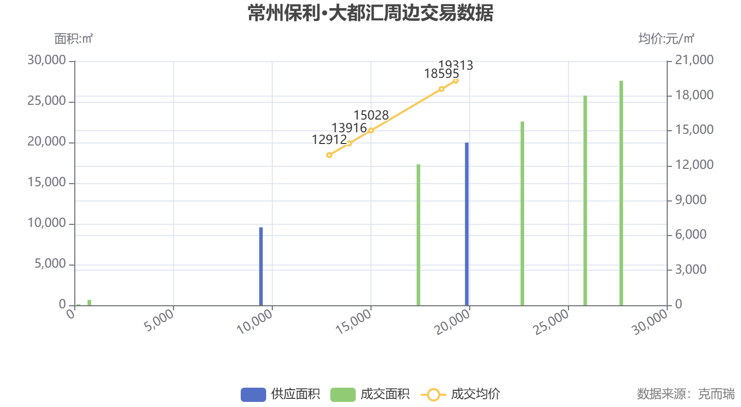 数据解读:根据克而瑞数据,保利大都汇在2025年12月成交面积达16851㎡,为近一年较高值,成交均价为12941元/㎡。2026年3月成交均价为12600元/㎡,供应面积7748㎡,成交面积2912㎡。整体来看,项目价格在12000-13500元/㎡区间波动,近期价格趋于平稳。