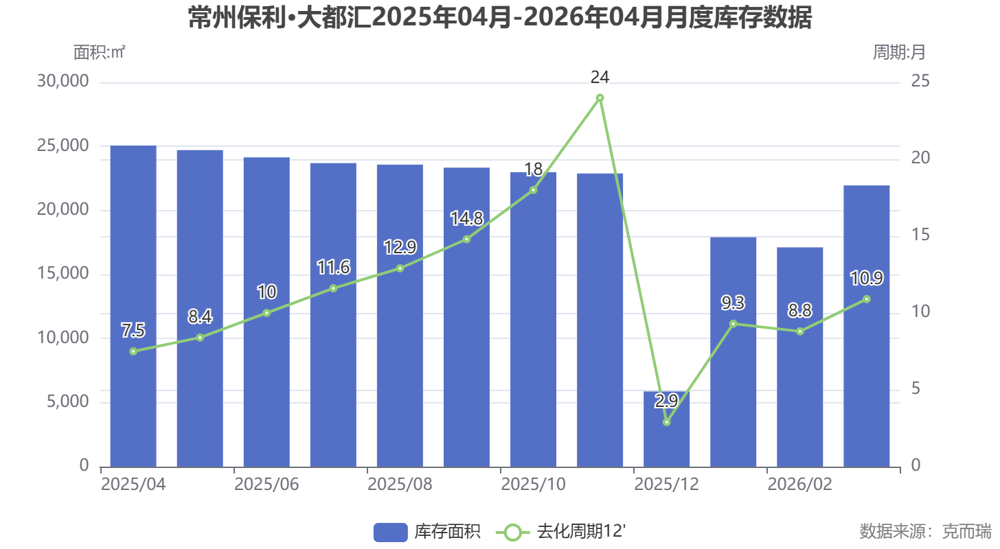 数据解读:根据克而瑞数据,截至2026年3月,保利大都汇库存面积为21953.69㎡,去化周期(12个月移动平均)为10.9个月。相较于2025年底,2026年初库存有所回升,去化周期相应调整,表明市场处于正常流通状态。