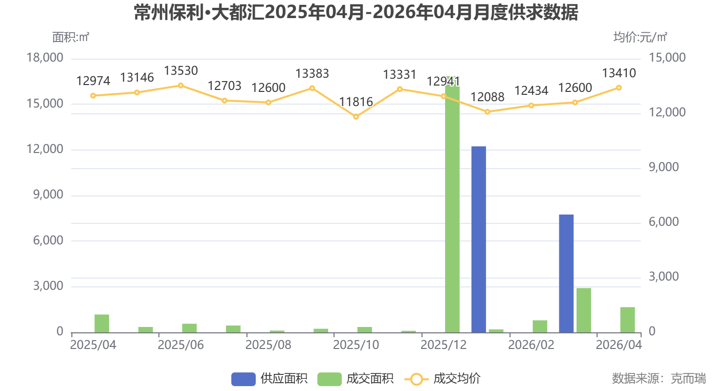 从2025年4月至2026年4月的月度供求数据来看,保利大都汇在过去一年中保持了一定的供应节奏。特别是在2025年12月,成交面积出现显著高峰,这与年底市场活跃度提升密切相关。