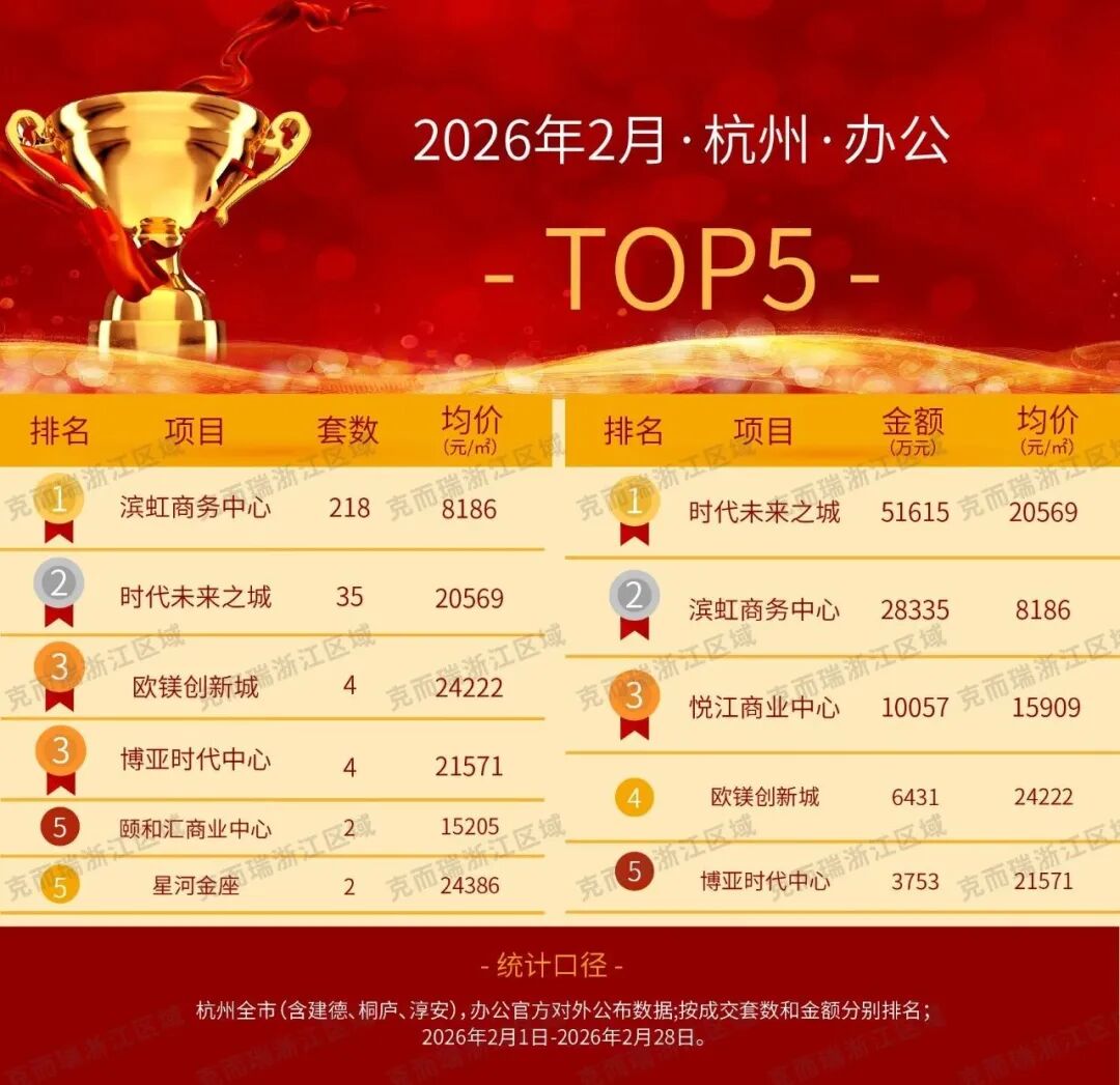 克而瑞浙江区域发布「2026年2月杭州热销榜」涵盖住宅、酒店式公寓、商业、办公四大子榜单,盘点杭州楼市各类热销楼盘,为市场提供一份可参考的“择优指南”:住宅榜单中,月映金沙庭以94套成交量登顶套数榜,成交均价38026元/㎡;同时,该项目以55613万元成交业绩登顶金额榜,成为双料销冠。酒店式公寓榜单中,滨虹商务中心以96套成交量居套数榜TOP1,成交均价11924元/㎡;欧镁创新城则凭借33182万元业绩摘得金额榜TOP1,成交均价34547元/㎡。商业榜单中,悦江商业中心成为套数&金额双料销冠,以27套成交量拿下套数榜第一,同时揽金7423万元居金额榜首位,成交均价15829元/㎡。