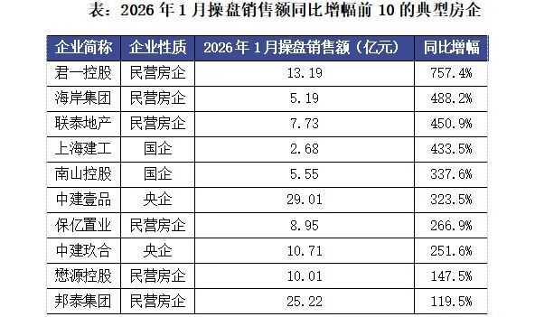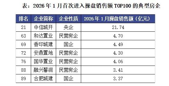 2026年1月共有7家企业首次进入了TOP100榜单,其中中信城开甚至直接闯进了TOP30。整体来看,这7家房企中有4家是中小民营房企,在市场筑底的背景下部分房企经营仍然较为平稳,实现了逆势爬升。