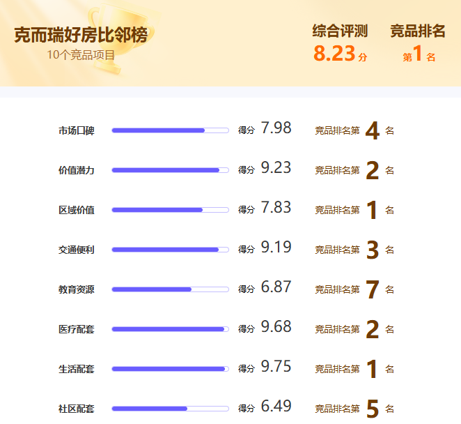 克而瑞好房点评网是房地产行业深耕 20 年的专业研究机构,其评测体系以"相邻对标"为核心逻辑——即在定位与地段相近的楼盘间展开多维度比拼,而非简单横向比较。这种机制确保了评选结果的公平性与实用性。