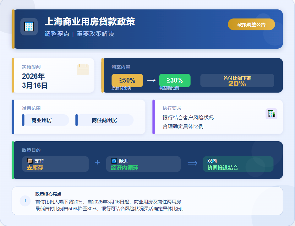 市场火热之际,楼市政策再迎利好。自2026年3月16日起,上海市商业用房(含“商住两用房”)购房贷款最低首付款比例调整为不低于30%。此前,该比例为不低于50%,此次调整直接降低20个百分点,大幅减轻购房者首付压力。