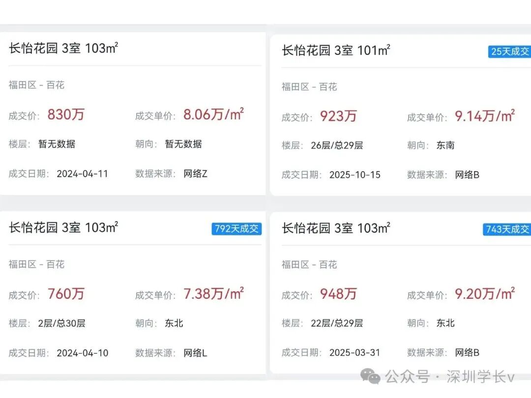 长城大厦88㎡从1370万跌到595万,南天一花园87㎡二房从1530万跌到700万,长城二花园从1265万跌到652万……