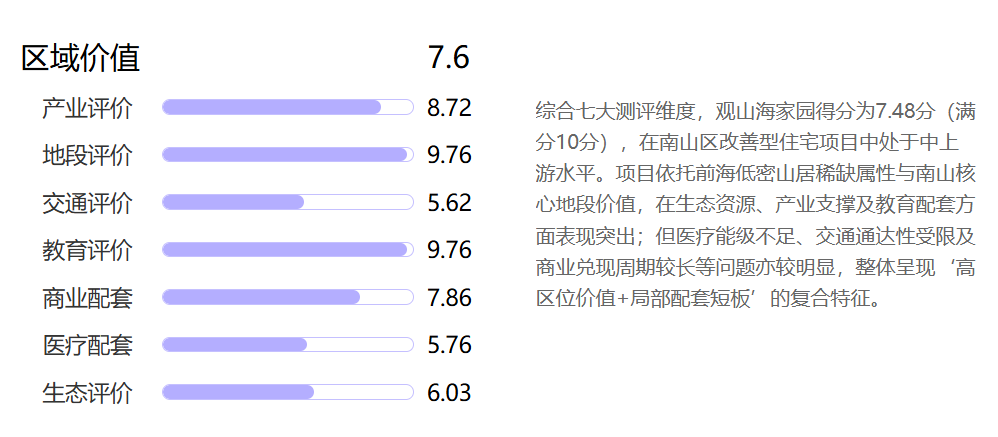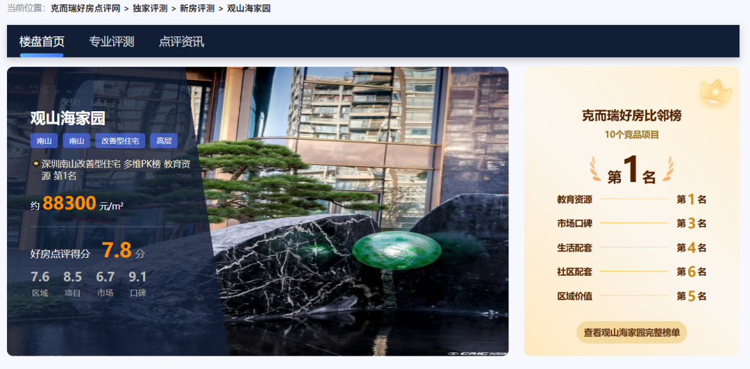 观山海家园是一款以高得房率、低密形态和纯粹圈层为核心竞争力的南山改善型住宅,精准切中注重空间效率与居住私密性的本地改善客群需求。其价值锚点在于稀缺的低密属性与实用主义产品逻辑,适合对通勤距离容忍度较高、更看重居家体验而非即时繁华配套的家庭。然而,项目在高端配套、精装品质及噪音控制上的不足,限制了其向更高能级客群的渗透。建议开发商强化社区生活场景营造,适度优化临路楼栋隔音设计,并通过透明化精装标准重建市场信任。若未来区域界面持续优化,项目有望在南山改善市场中稳步释放长期价值。在好房点评网综合评分是7.8分,在克而瑞好房比邻榜10个竞品项目中,排名第一,尤其是其教育资源较为突出。