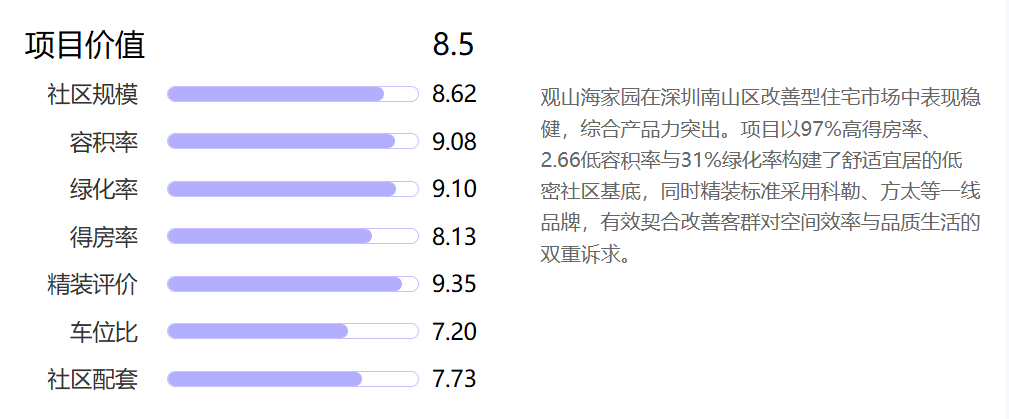 观山海家园的核心价值在于其在前海高强度开发区域中提供了稀缺的低密度、生态化居住体验,比如超低容积率,项目容积率仅约2.65-2.66,远低于前海片区普遍4.8以上的容积率,是片区罕见的小高层纯商品房社区。此外是优质生态资源,背靠大南山,部分户型可享270°山景,社区内打造约4.2万㎡度假式园林及水庭院瀑布,实测负氧离子浓度高,形成了显著的生态健康卖点。主力户型为95-138㎡的三至四房,通过拓展设计,得房率高达95%-97%,空间利用率佳。尤其是138㎡楼王户型为2梯2户板楼设计,私密性突出。因此,项目价值评分8.5分,在容积率、得房率以及精装评价上,均获得高水平得分。