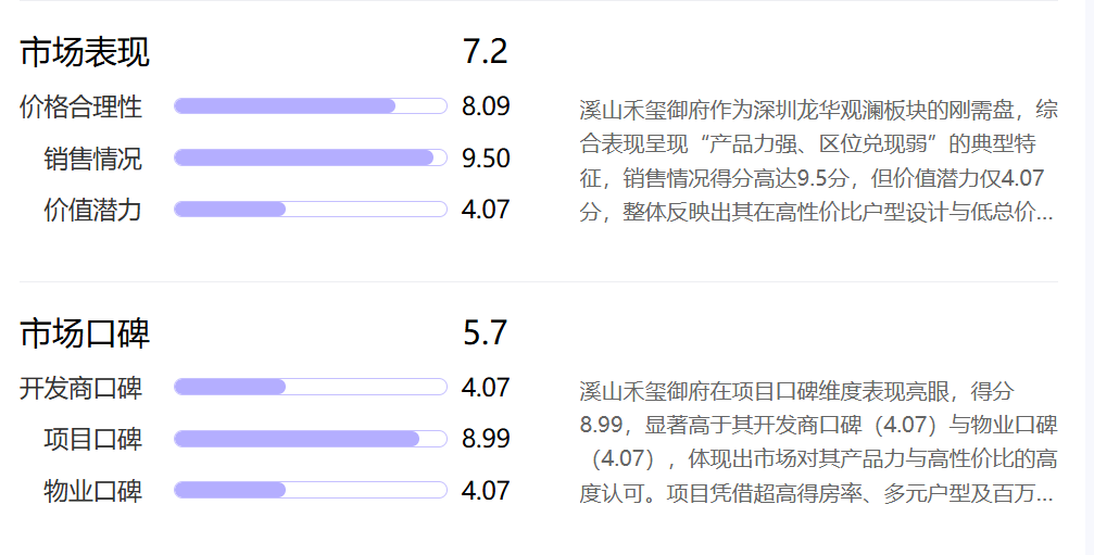 溪山禾玺御府作为深圳龙华观澜板块的刚需盘,综合表现呈现“产品力强、区位兑现弱”的典型特征,销售情况得分高达9.5分,但价值潜力仅4.07分,整体反映出其在高性价比户型设计与低总价策略上具备吸引力,却受限于区域配套成熟度与交通通达性。溪山禾玺御府在项目口碑维度表现亮眼,得分8.99,显著高于其开发商口碑(4.07)与物业口碑(4.07),体现出市场对其产品力与高性价比的高度认可。项目凭借超高得房率、多元户型及百万方大城配套精准击中刚需客群核心诉求,但在品牌背书、物业服务质价比及区位成熟度方面存在明显短板,整体呈现‘产品强、配套弱、服务平’的特征。