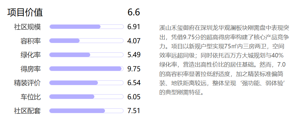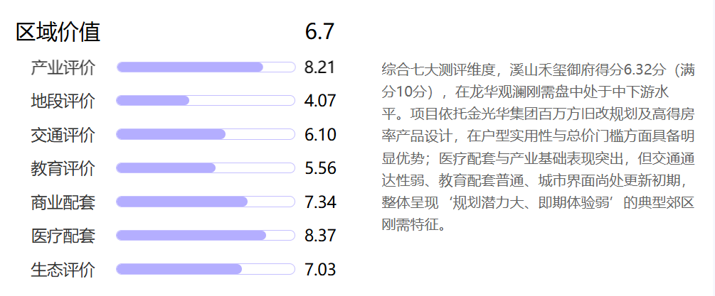 综合七大测评维度,溪山禾玺御府得分6.7分(满分10分),在龙华观澜刚需盘中处于中下游水平。项目依托金光华集团百万方旧改规划及高得房率产品设计,在户型实用性与总价门槛方面具备明显优势;医疗配套与产业基础表现突出,但交通通达性弱、教育配套普通、城市界面尚处更新初期,整体呈现‘规划潜力大、即期体验弱’的典型郊区刚需特征。