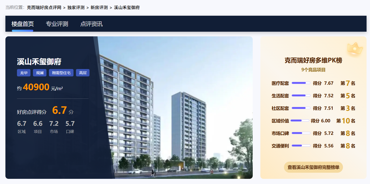 溪山禾玺御府是一款以极致空间效率和高车位配比为核心竞争力的刚需型住宅,其价值锚点在于用最低总价实现最大居住功能,适合预算有限、重视实用性的首置家庭,尤其是对地铁依赖度不高、能接受短期配套不成熟的购房者。项目在龙华观澜板块中具备一定差异化优势,但需警惕其区位兑现周期长、城市界面杂乱及物业支撑薄弱等结构性短板。若未来旧改进度加快、教育商业配套逐步落地,项目有望释放更多潜力;但若购房者对即住体验、品牌保障或通勤效率有较高要求,则建议优先考虑地铁沿线或央企开发的竞品项目。在克而瑞好房多维PK榜中,9个竞品产品PK,综合得分6.7分,其中社区配套较为亮眼,而其余维度稍微逊色。