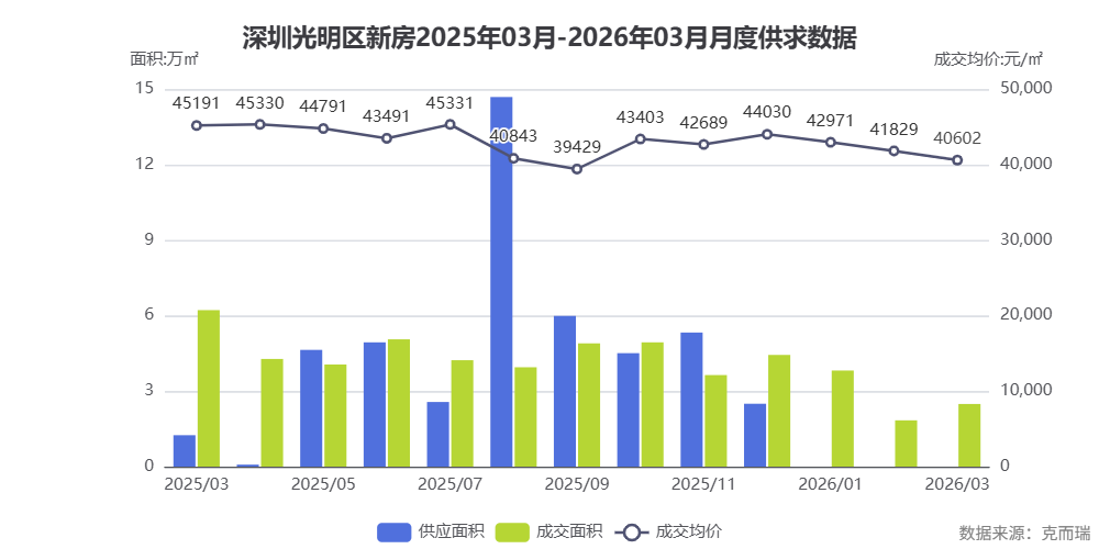 数据解读: 根据克而瑞数据,2025 年 3 月至 2026 年 3 月光明区新房成交均价维持在 4-4.5 万元/㎡区间,市场整体趋稳。满京华金硕臻府备案均价约 5.5 万元/㎡,高于区域平均水平,体现其高端产品定位和市场认可度。