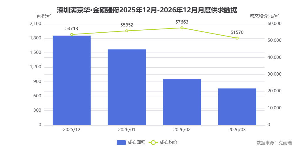 数据解读: 根据克而瑞数据,满京华金硕臻府 2025 年 12 月至 2026 年 3 月成交均价在 5.1-5.8 万元/㎡区间波动,2026 年 2 月达到峰值 57663 元/㎡,显示市场对高端产品的持续认可。成交面积逐月递减反映货量逐步去化。