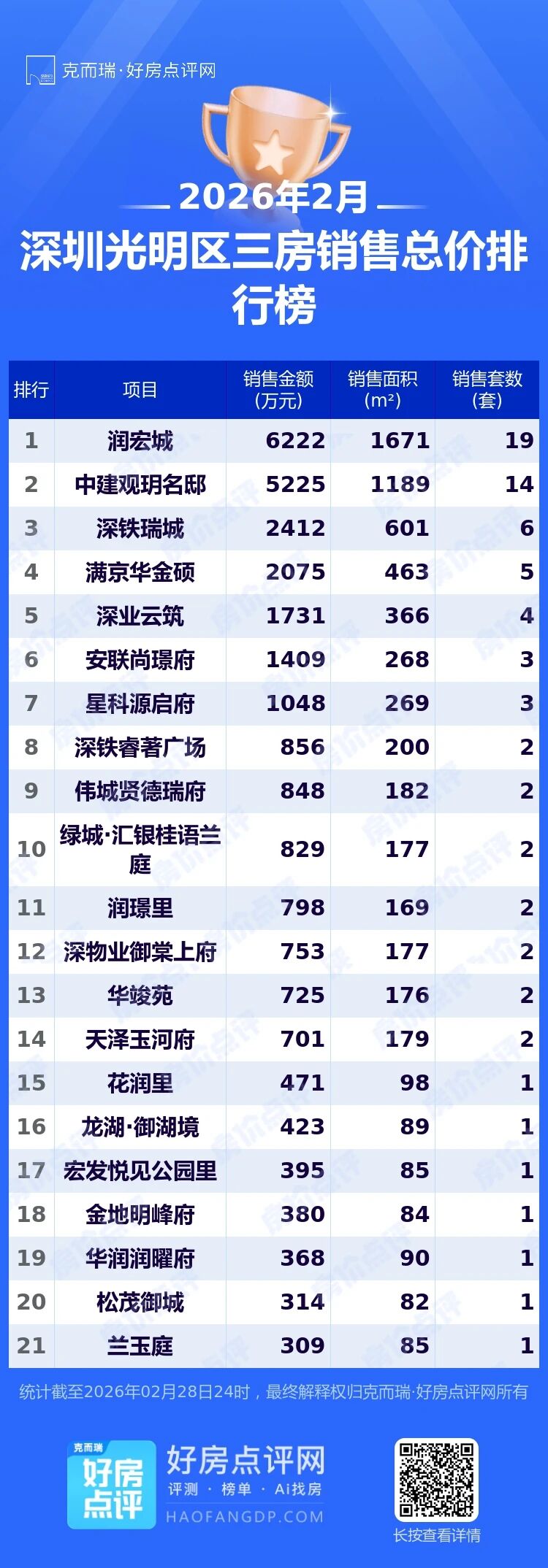 本次光明区2月成交榜单的前三甲分别是润宏城、中建观玥名邸和深铁瑞城。