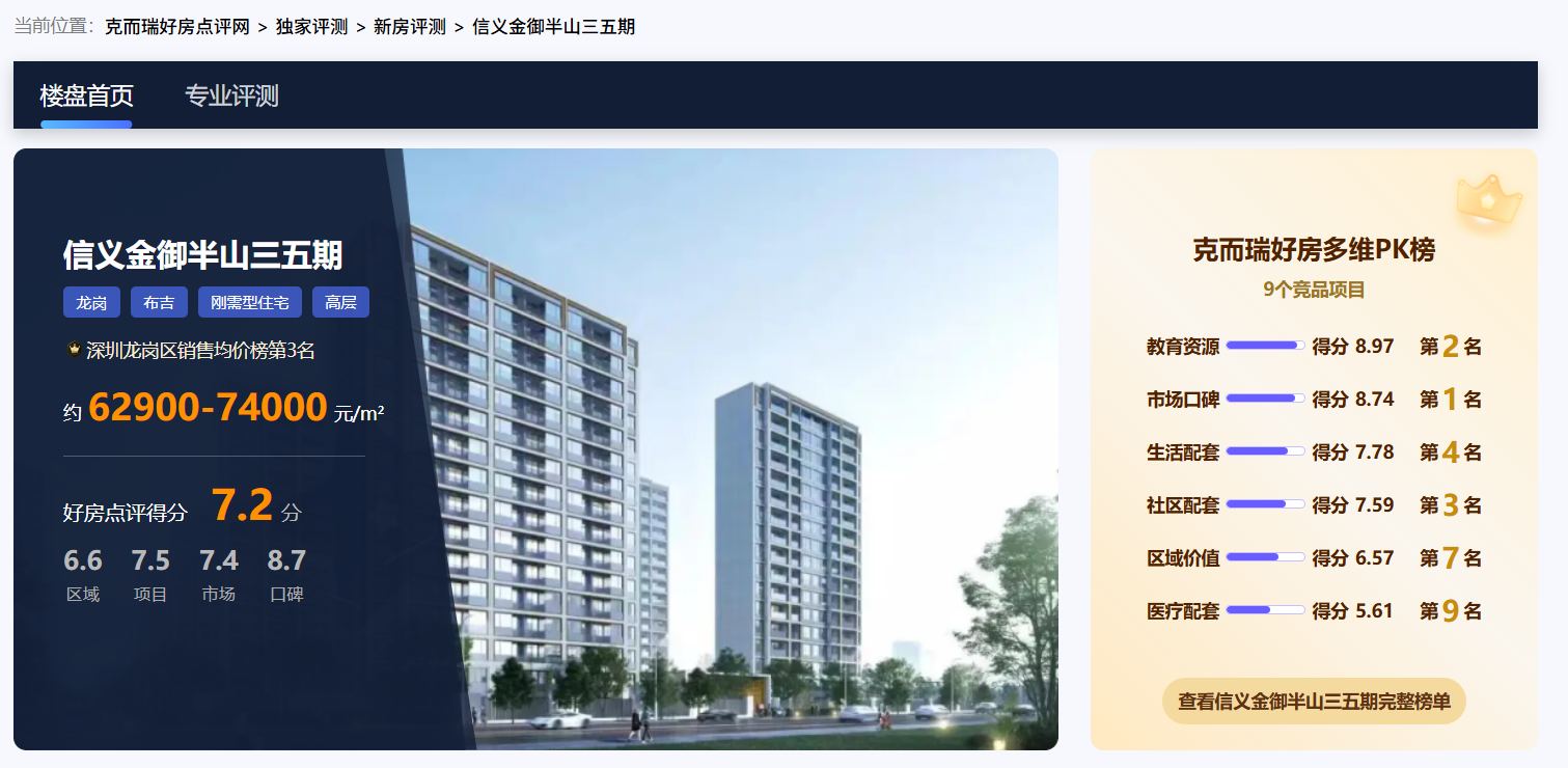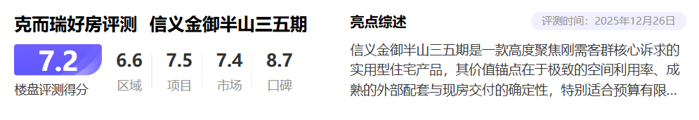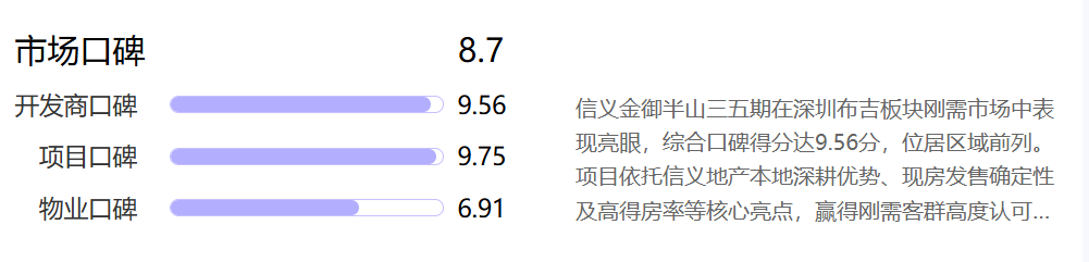 信义金御半山三五期在深圳布吉板块刚需市场中表现亮眼,综合口碑得分达9.56分,位居区域前列。项目依托信义地产本地深耕优势、现房发售确定性及高得房率等核心亮点,赢得刚需客群高度认可,展现出较强的性价比与兑现力。