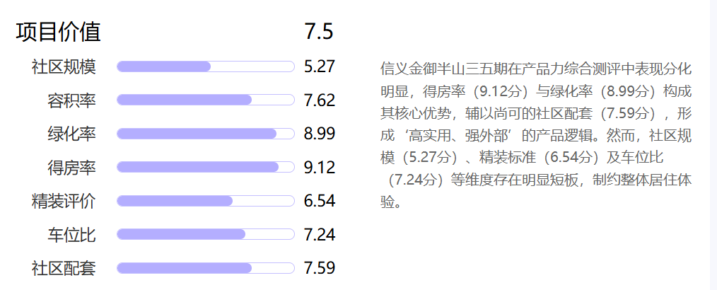 信义金御半山三五期在产品力综合测评中表现分化明显,得房率(9.12分)与绿化率(8.99分)构成其核心优势,辅以尚可的社区配套(7.59分),形成‘高实用、强外部’的产品逻辑。然而,社区规模(5.27分)、精装标准(6.54分)及车位比(7.24分)等维度存在明显短板,制约整体居住体验。