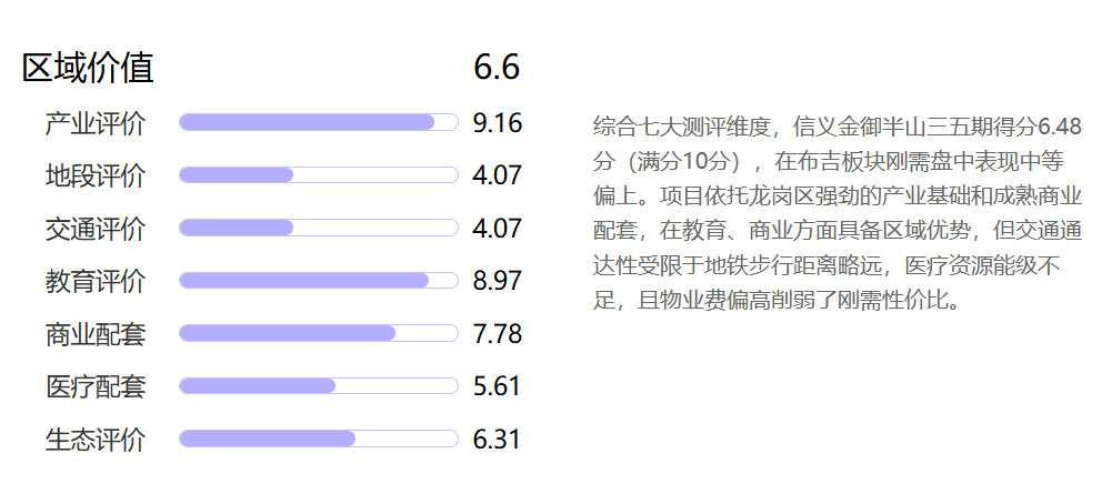综合七大测评维度,信义金御半山三五期得分6.48分(满分10分),在布吉板块刚需盘中表现中等偏上。项目依托龙岗区强劲的产业基础和成熟商业配套,在教育、商业方面具备区域优势,但交通通达性受限于地铁步行距离略远,医疗资源能级不足,且物业费偏高削弱了刚需性价比。