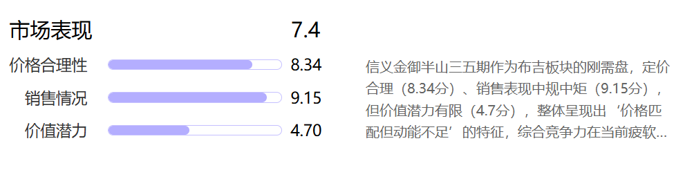 信义金御半山三五期作为布吉板块的刚需盘,定价合理(8.34分)、销售表现中规中矩(9.15分),但价值潜力有限(4.7分),整体呈现出‘价格匹配但动能不足’的特征,综合竞争力在当前疲软市场中属中等偏下水平。